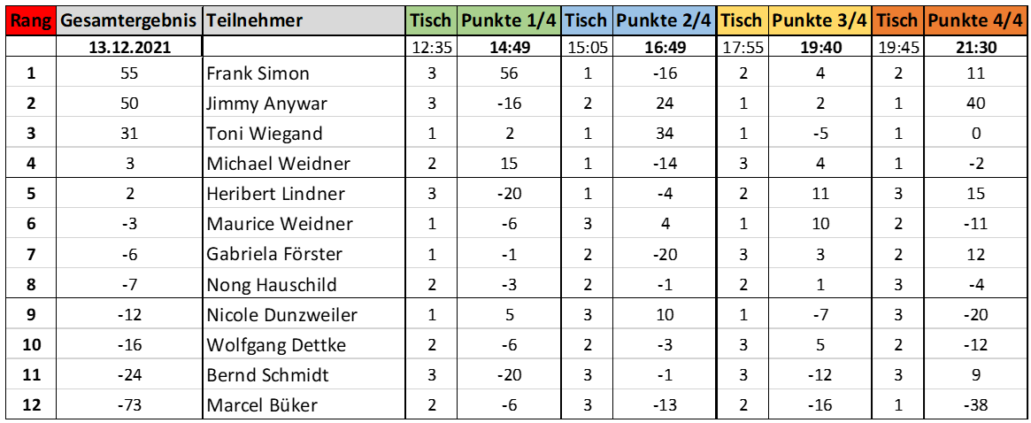 Zur 3. Marathon-Chouette habe ich 16 Backgammon-Freunde gefunden und für den am Samstag, den 11.12.2021 nach Lampertheim in die Biedesandhalle eingeladen. Auf Grund steigenden Corona-Inzidenzen und einigen anderen Problemen starteten wir leider nur mit 12 Teilnehmer.