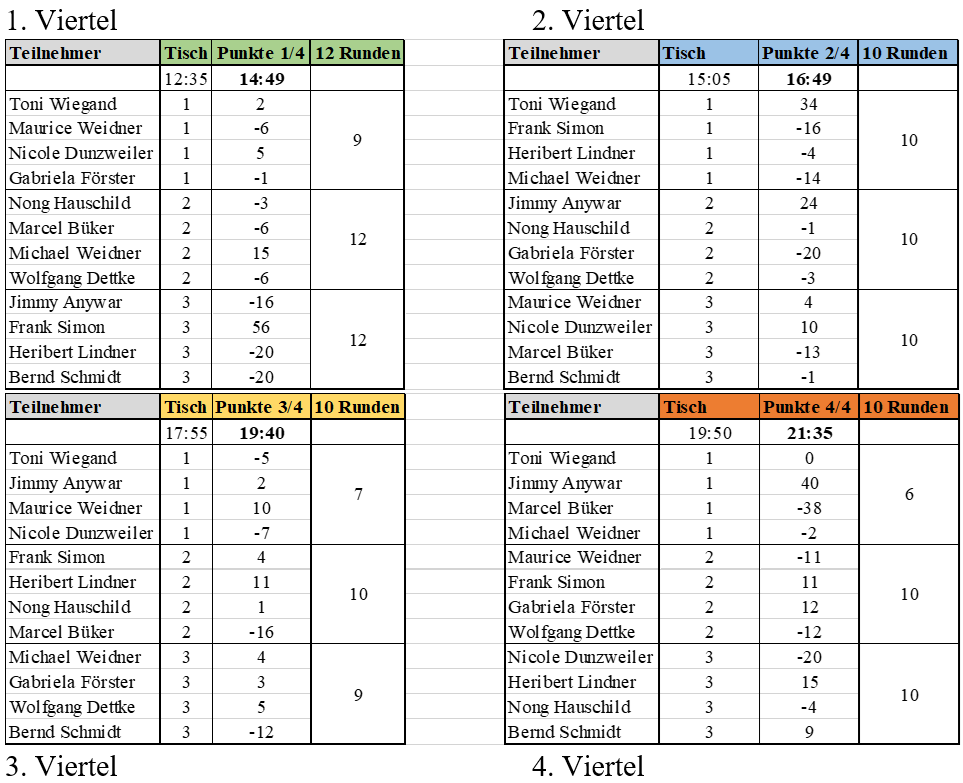 Im ersten Durchgang holte sich Frank Simon einen satten Vorsprung von 56 Punkten gefolgt von Michael Weidner mit 15 Punkten. Die restlichen Spieler bewegten sich überwiegend im negativen Bereich.