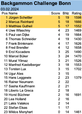 Zum ersten Bonner Turnier im neuen Jahr kamen 23 Spielerinnen und Spieler ins Restaurant Sander. Erfreulicherweise waren darunter einige, die erstmals oder nach sehr langer Zeit wieder an einem Turnier teilnahmen. Das Spielen mit Uhr war für sie neu, aber mit etwas Hilfe durch die Routiniers war das kein Problem.