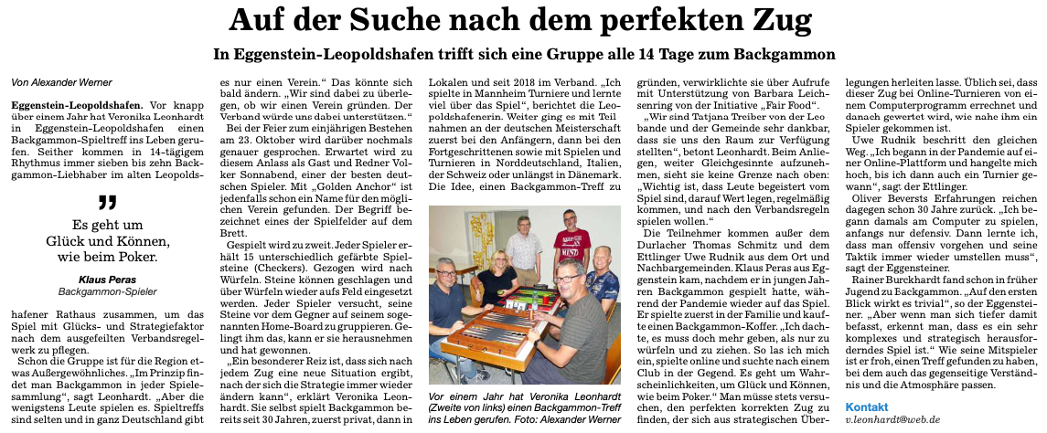 Im Lokalteil der Badischen Neuesten Nachrichten erschien am 14.9. ein interessanter Artikel über die Backgammon-Aktivitäten in Eggenstein-Leopoldshafen. Die Zeitung hat das Thema auf die Initiative von Veronika Leonhardt hin aufgegriffen.