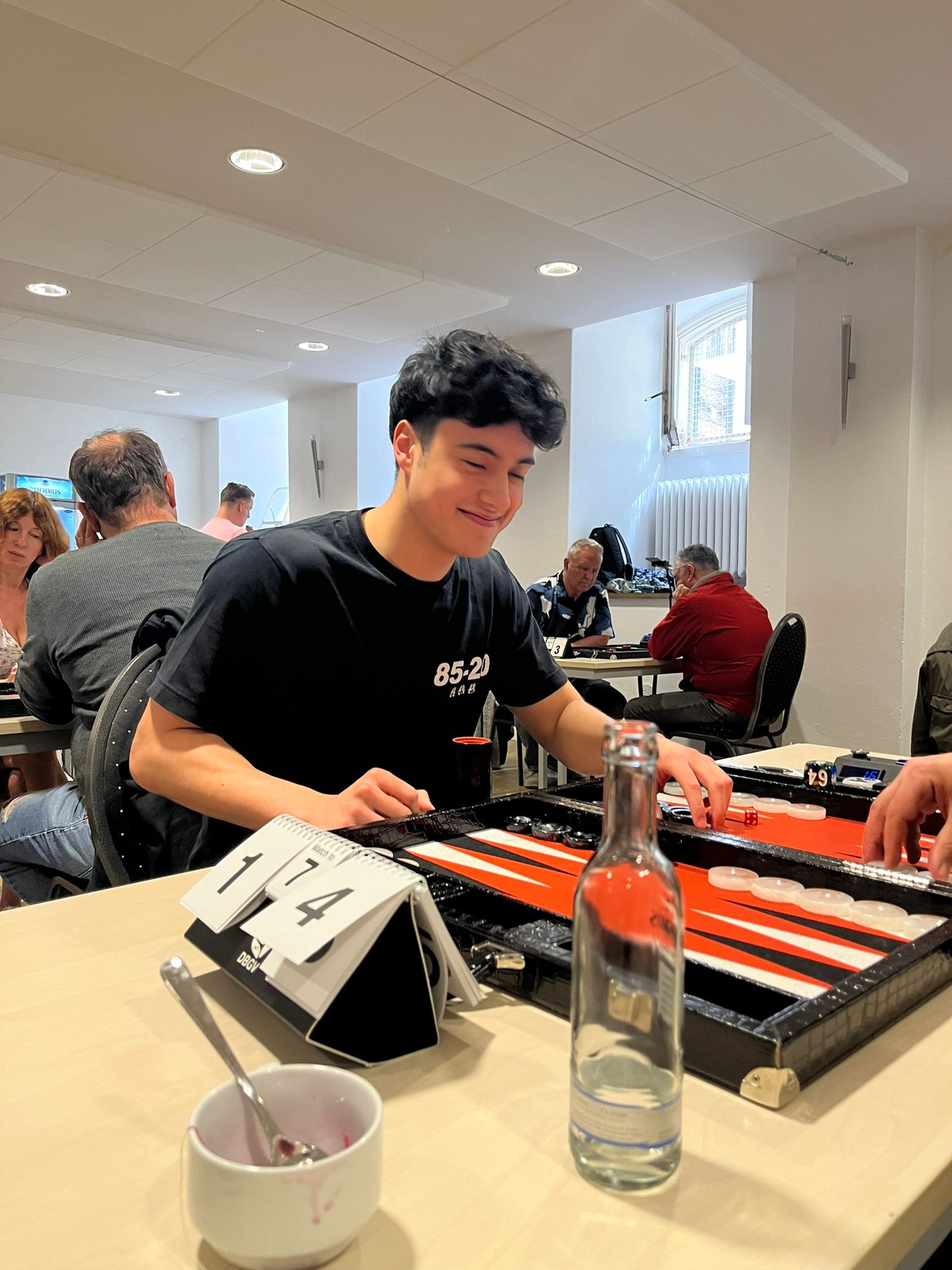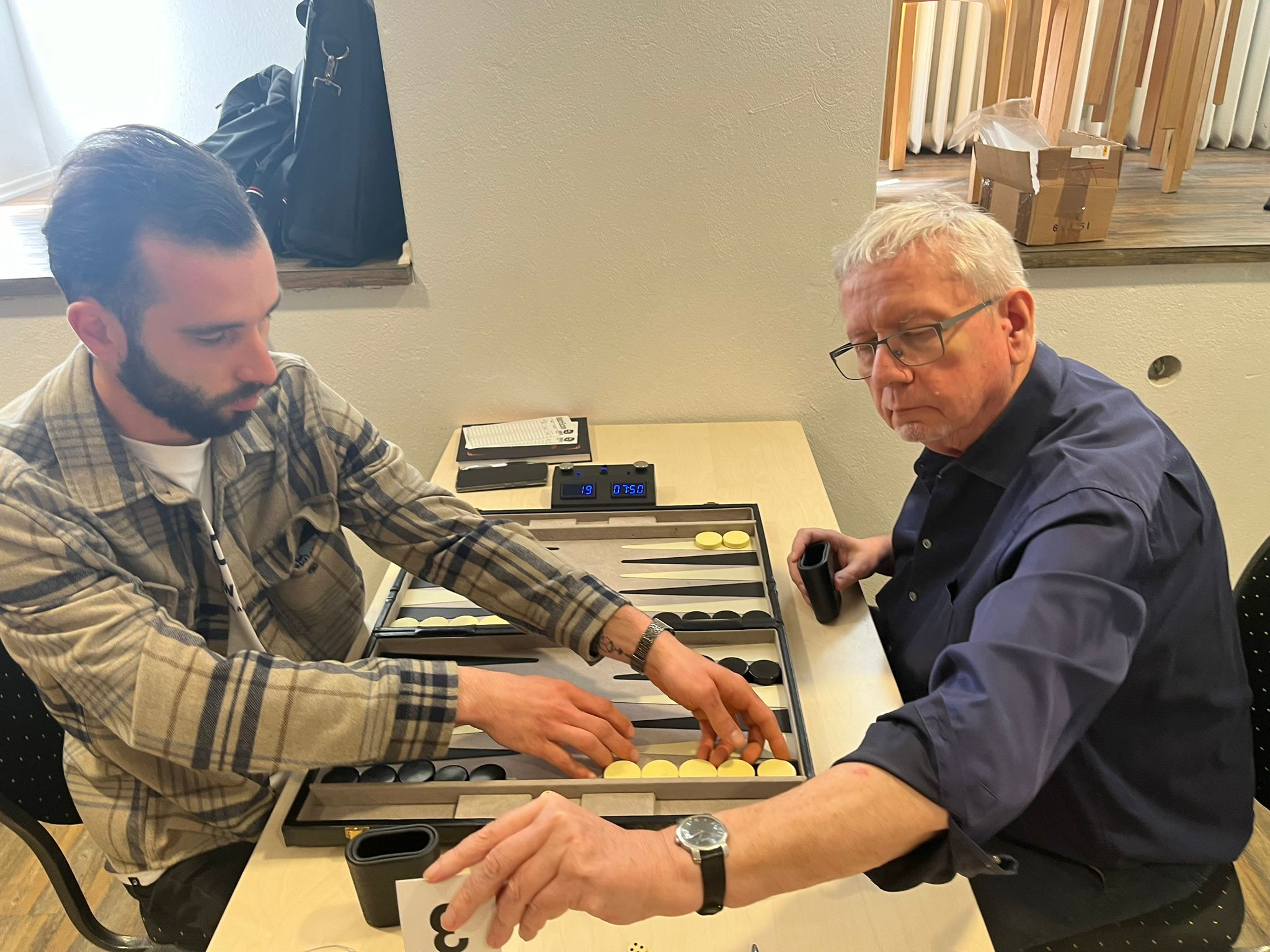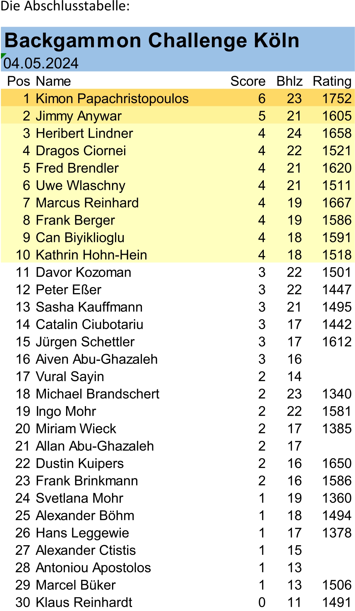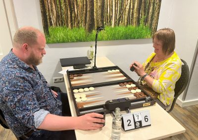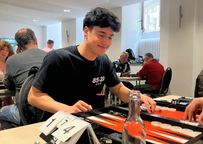 Mehr als erfreulich ist aktuelle Trend, dass sich beständig neue Gesichter, d.h. Spielerinnen und Spieler, verlaufen und bei uns Zuflucht finden. Eine Speed-Einweisung zur angsteinflößenden Uhr, der Crawford-Regel, dem Doppler-Würfel, und schon waren die neuen Gladiatoren für die Arena Köln gerüstet. Was Ihnen an Erfahrung fehlte, machten sie schnell mit Kampfgeist und Spielfreude wett und ließen auf Anhieb den ein oder anderen Favoriten stolpern. So soll es sein, jawohl.