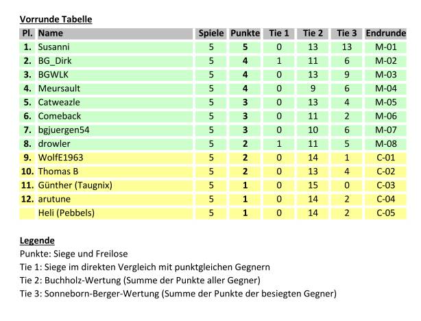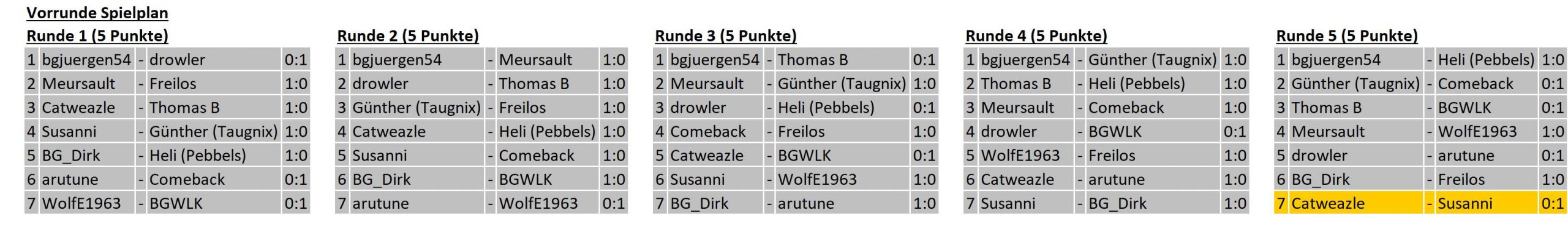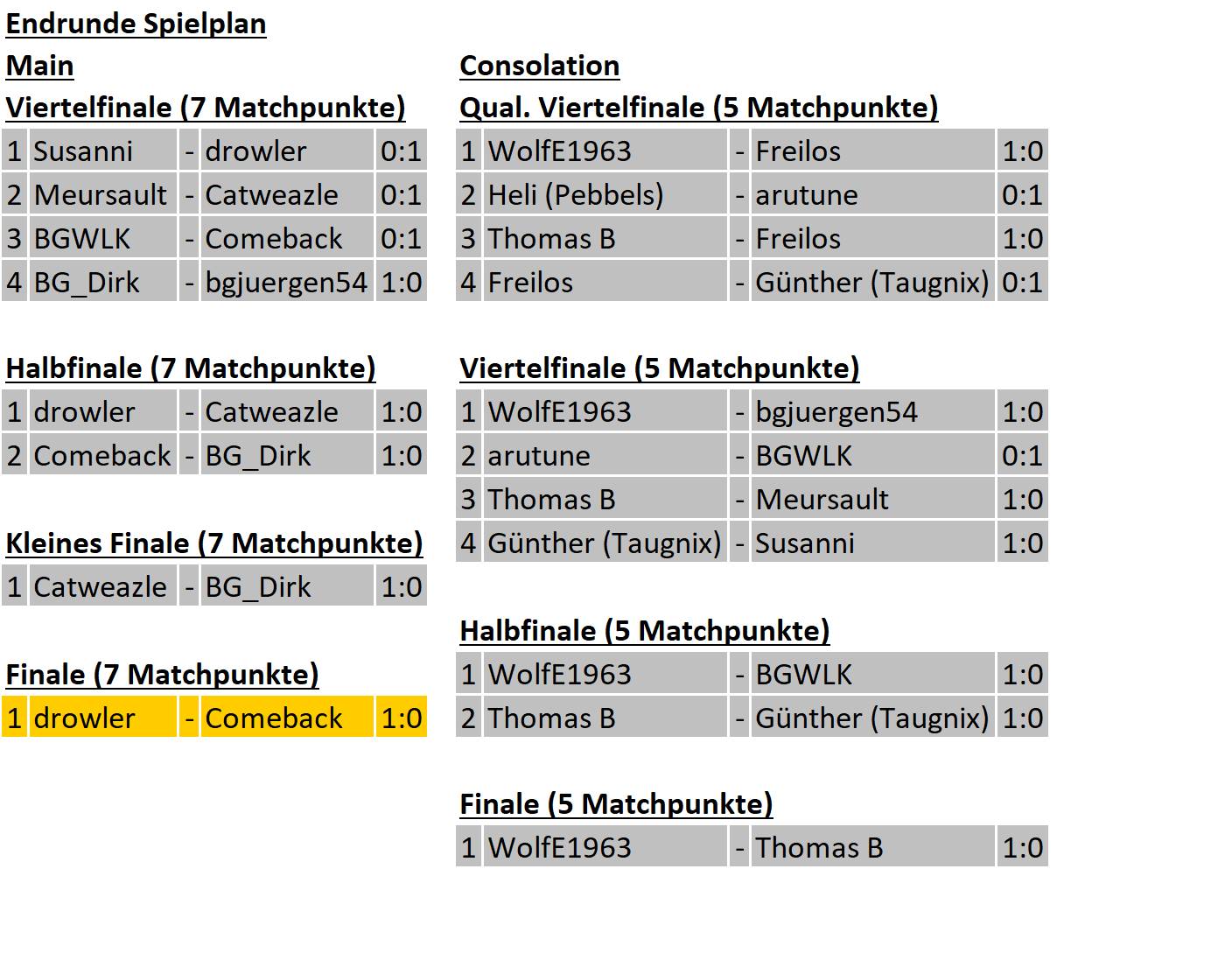 Das Turnier wurde in einer Vorrunde im Modus verkürztes Jeder gegen Jeden mit 5 Spielen a‘ 5 Punkten und einer Main- und Consolation– Runde im Ko-System ausgespielt. Nach einem spannenden 8 stündigem Turniertag stand am Abend der Turniersíeger drowler alias Dustin Kuipers fest. Den zweiten Platz belegte Comeback alias Rainer Birkle.
