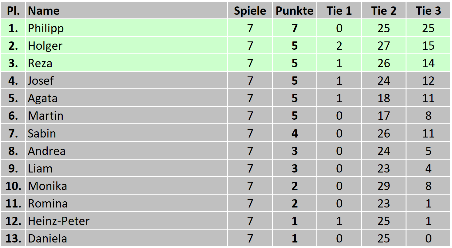 Am Ende des Tages wurden die drei Sieger (1. Reza, 2. Holger, 3. Agata) des Turniers gekürt. Herzlichen Glückwunsch!
