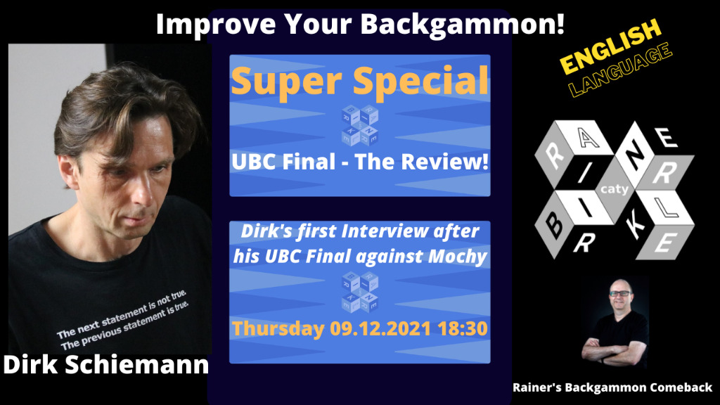 Auf dem YouTube-Kanal „Rainers Backgammon Comeback“ wird am 9. Dezember um 18:30 Uhr ein Interview mit Dirk Schiemann live gestreamt. Der Großmeister wird über seine Erlebnisse, Eindrücke und seine interessanten sowie kritischen Situationen des UBC-Finales sprechen. Jeder kann dazu gerne vor dem Stream Fragen, die er/sie gerne an Dirk stellen möchte, an den Moderator Rainer Birkle über E-Mail oder Discord senden. Das Interview wird in englischer Sprache stattfinden, um auch internationale Backgammon-Spieler*innen zu erreichen.