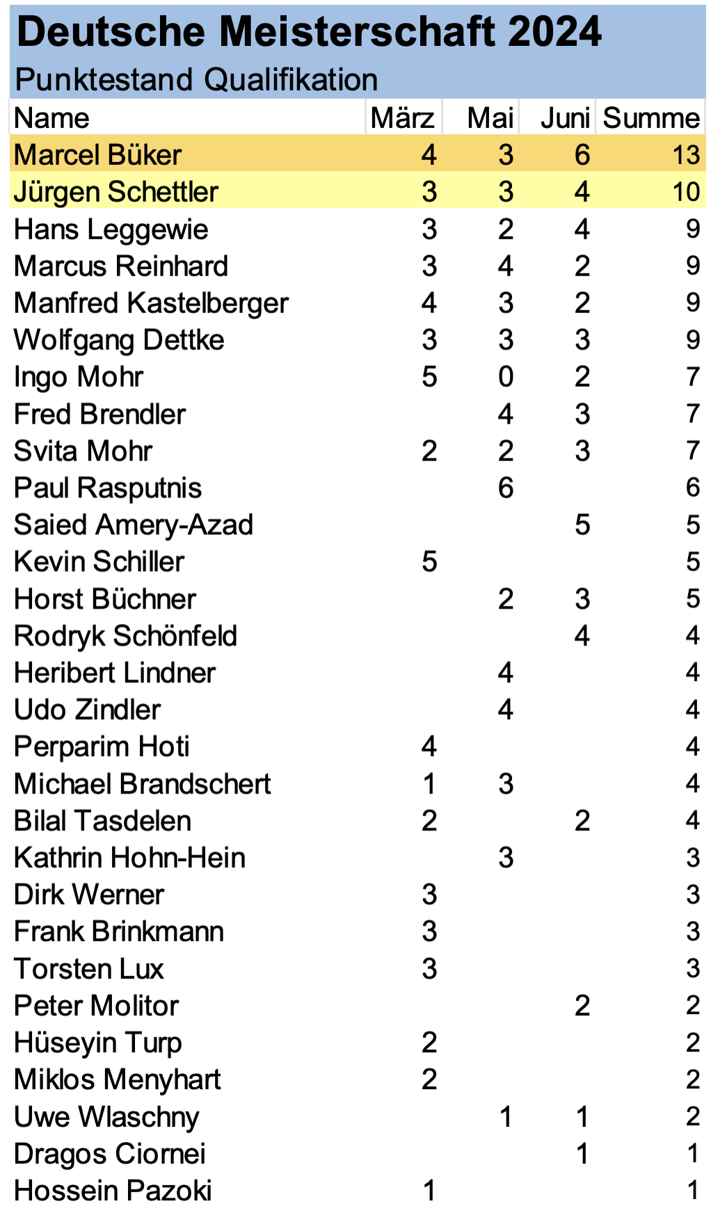 Marcel Büker, Stammgast auf den Turnieren der „Hirnakrobat“-Serie, war am 10.6. nicht zu schlagen. Er gewann alle 6 Matches und sicherte sich zusätzlich den Sidepool. Er führt damit auch die Jahreswertung für die Qualifikation zur Deutschen Meisterschaft 2024 klar an. Zweiter wurde Saied Amery-Azad, der nur gegen Marcel verlor. Mit vier Matcherfolgen belegten Hans Leggewie, Rodryk Schönfeld und der Mitorganisator Jürgen Schettler den geteilten dritten Platz.