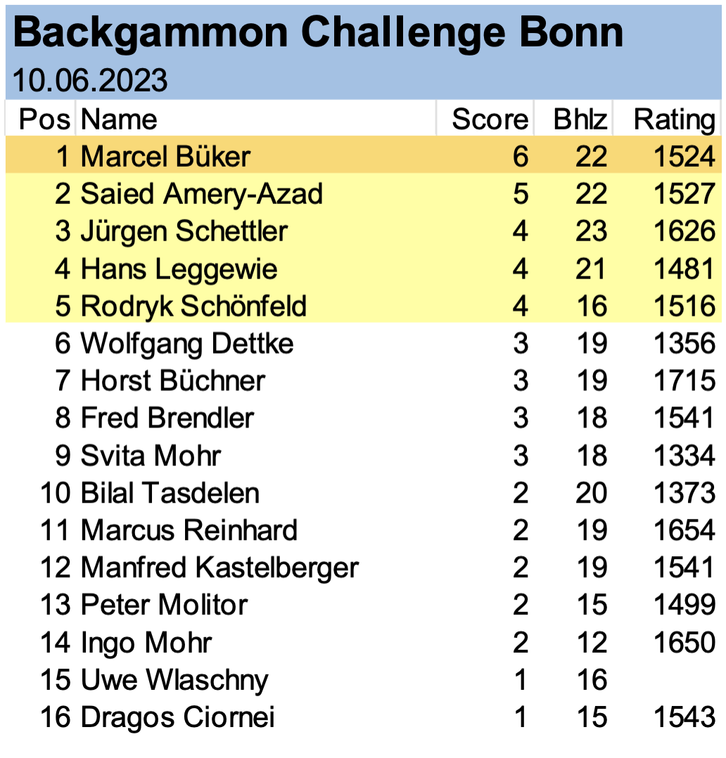 Eine hervorragende Location mit guter Bewirtung, leicht erreichbar direkt am Hauptbahnhof, ein Turniermodus der jedem 6 Matches garantiert, das sind nur einige der Pluspunkte der Bonner Turniere. Nur bei der Beteiligung gibt es noch Luft nach oben. Kommt mal nach Bonn, wir spielen dort in den nächsten Monaten immer am zweiten Samstag.