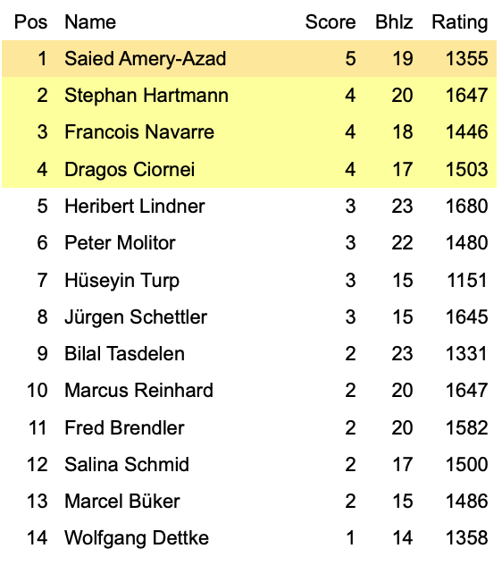 Eine Woche nach der Deutschen Meisterschaft waren offenbar einige Backgammon-Freunde noch spielmüde, so dass am 11. Juni nur ein recht überschaubares Teilnehmerfeld zustande kam. Saied Amery-Azad, der schon im Vormonat in Köln geteilter Sieger war, erkämpfte sich diesmal den alleinigen ersten Rang. Stephan Hartmann, François Navarre und Dragoș Ciornei waren die weiteren Preisträger, wobei Stephan zusätzlich den Sidepool gewann.