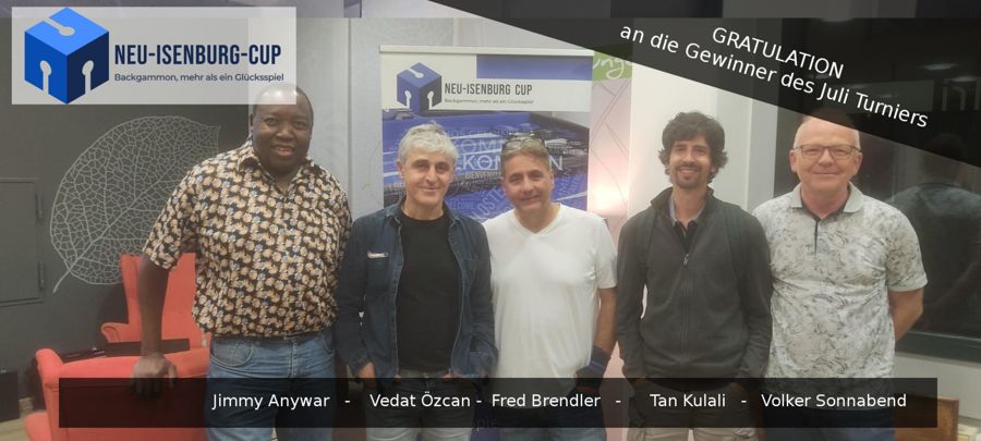 Nach 6 Runden konnten sich 5 Spieler mit einer herausragenden Kombination aus strategischem Denken und ruhigen Nerven als Sieger des Neu-Isenburg CUPs durchsetzen. Gratulieren dürfen wir zum Turniererfolg: Fred Brendler, Jimmy Anywar, Tan Kulali, Vedat Özcan und Volker Sonnabend.