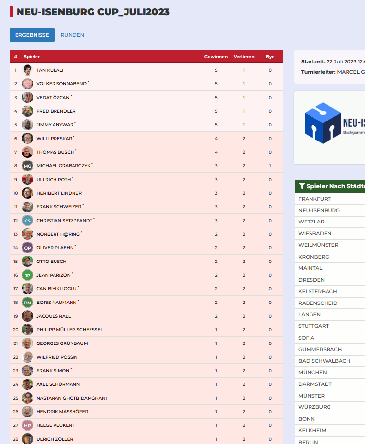 das Backgammon-Turnier im Rahmen des 12. Neu-Isenburg CUP im Juli war ein begeisterndes Ereignis, das die Spieler in den Bann zog. Mit spannenden Duellen, strategischen Zügen und überraschenden Wendungen bot das Turnier eine Fülle an aufregenden Momenten.