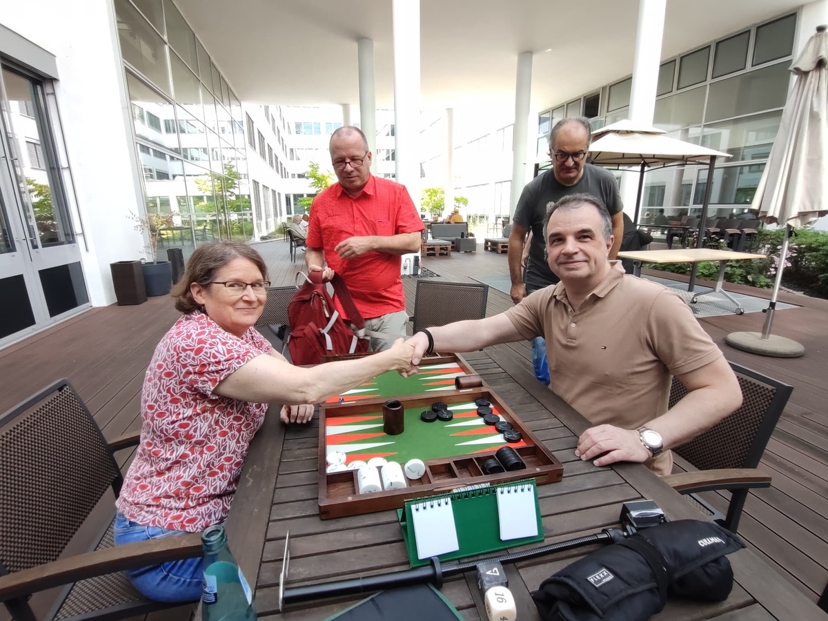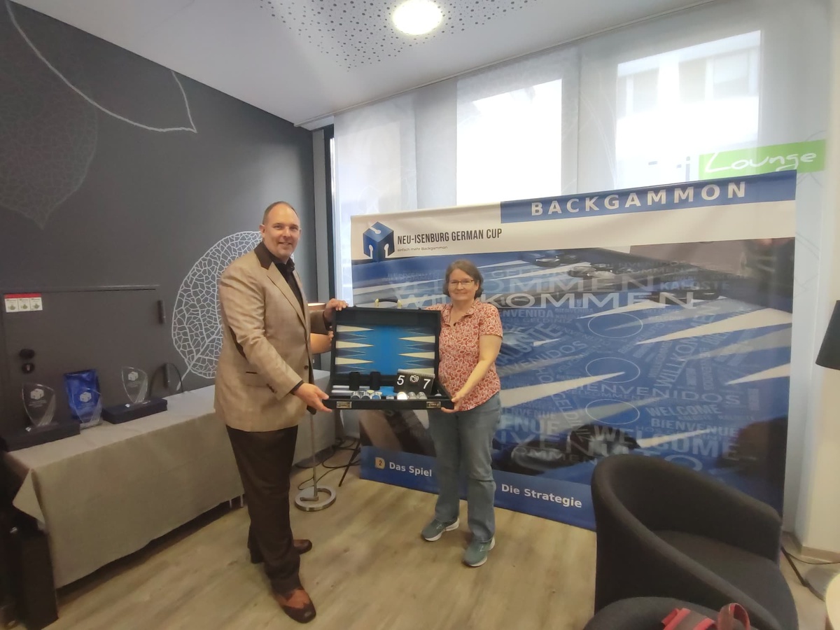 Dann gab es noch ein Added One-Pointer Turnier wo ein wunderschöner Backgammon-Koffer auf den Sieger wartete. Ann Pocknell, die in der Main nicht wirklich von „Fortune geküsst“ war, gewann Runde für Runde und selbst im Finale wo Mario Kühl, „der Endgegner“ auf sie wartete, setzte Ann auf Ihre Erfahrung und besiegte den amtierenden Vizeweltmeister. Gratulation Ann zu diesem tollen Erfolg und viel Freude mit dem Board.