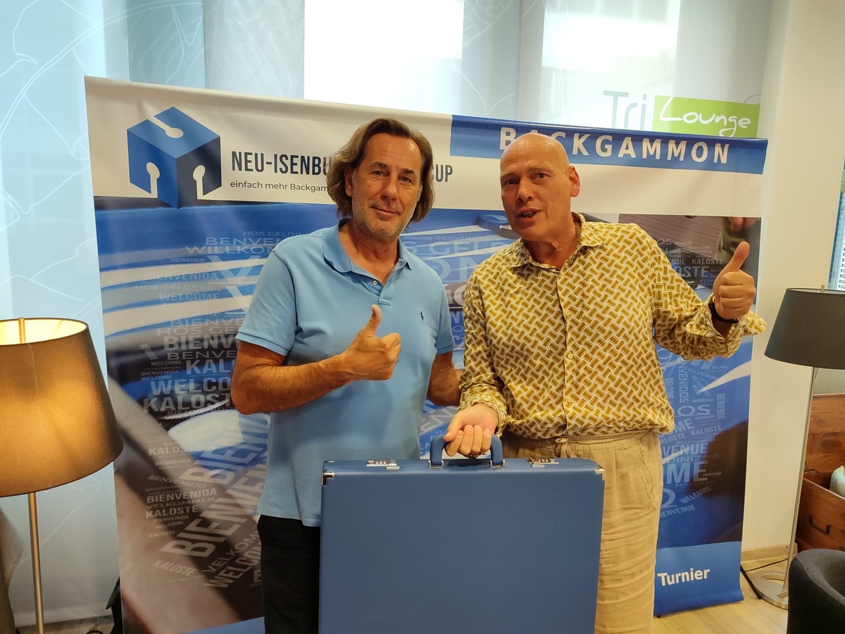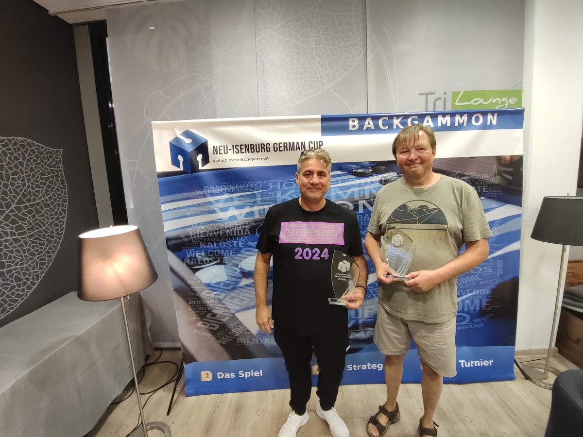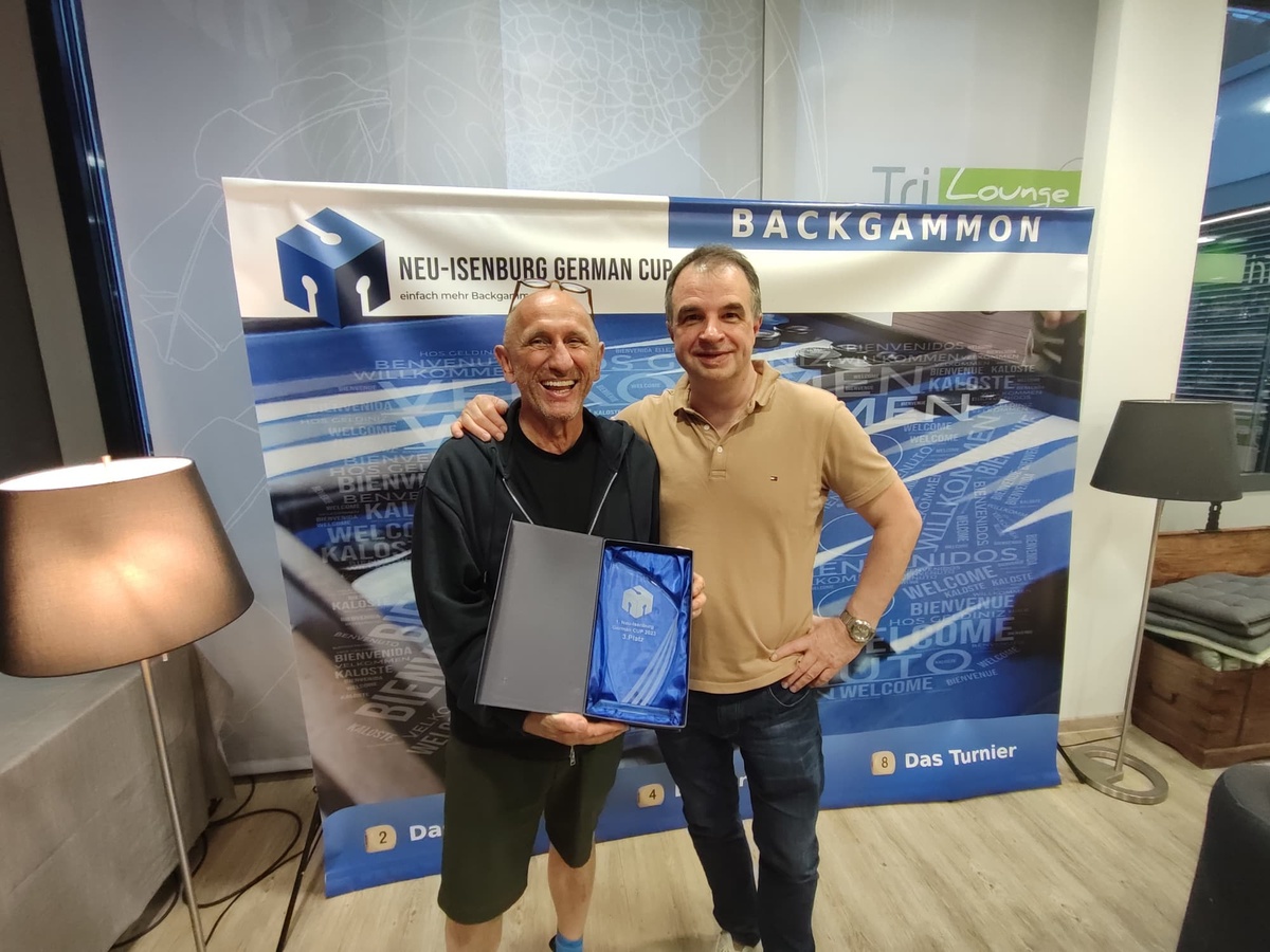 Der 1. Neu-Isenburg German CUP ist vollbracht und wir haben einen Turniersiegerermittelt. Die Rahmenbedingungen an diesem Wochenende waren hervorragend, 31 Teilnehmerfanden sich zum Turnierstart in der Tri-Lounge ein. Großmeister, Deutsche Meister, Vizeweltmeister, “Alte-Hasen“ und die Experten der Szene waren vertreten und eins war von vornherein klar, die Qualität des Turniers ließ nicht zu wünschen übrig. Ausreichend Platz war vorhanden und da das Wetter noch mitspielte konnten wir den wunderbaren Außenbereich nutzen. Dank der Turniersoftware ging die Auslosung reibungslos und das Turnier ging pünktlich los. Durch das Drei-Leben System hatte jeder Spieler die Chance auf „einfach mehr Backgammon“ und sollte man dann doch innerhalb der ersten 6 Runden ausscheiden wartete noch eine Last-Chance auf die Teilnehmer. Es wurden insgesamt 11 Runden und 92 Matches ausgetragen und gratulieren zum Turniererfolg dürfen wir : 1.) Frank Schweizer Turniersieger, gefolgt von: 2.) Fred Brendler 3.) Mario Kühl 3.) Jerzy Behnke 5.) Kimon Papachristopoulos.