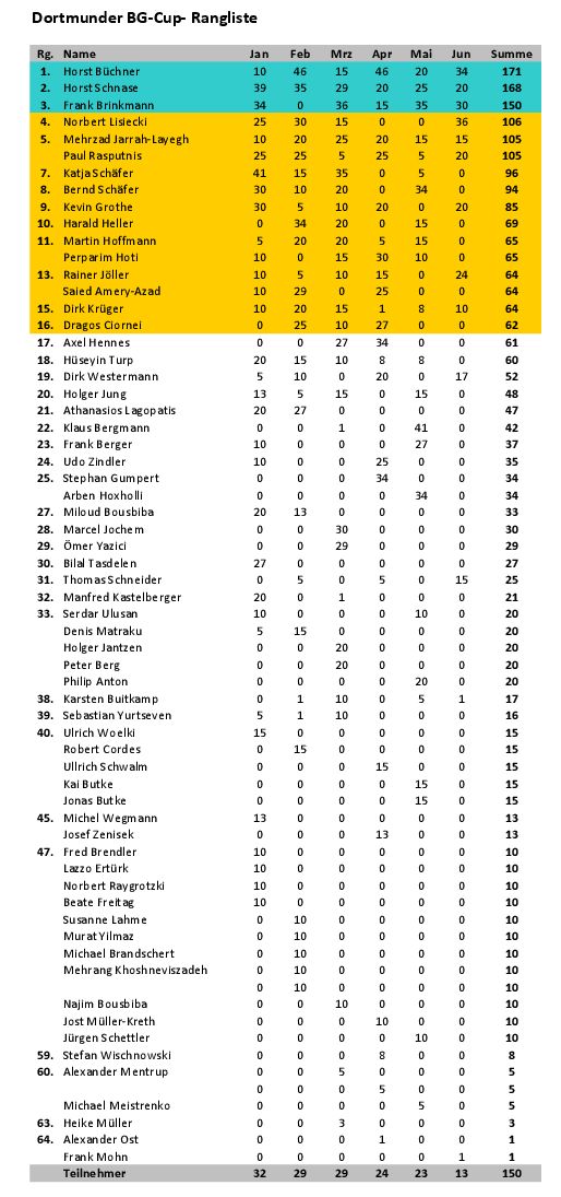 In der Rangliste führt Horst Büchner mit 171 Punkten, vor Horst Schnase mit 168 Punkten und Frank Brinkmann mit 150 Punkten.