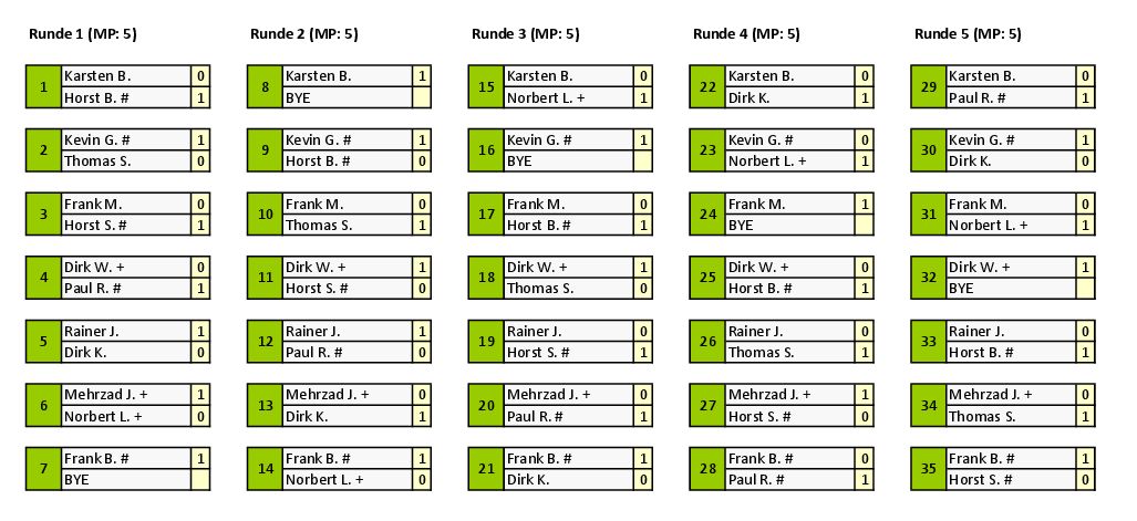 Das Turnier war, durch die niedrige Spieleranzahl, sehr entspannt. Vorrunde und Final-Runde konnten zügig durchgespielt werden, sodass der Turnierabend schon gegen 21.30 Uhr beendet werden konnte.