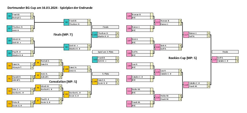 Mit Thorben Hoffmann konnte 1 neuer Spieler begrüßt werden, der es auch gleich ins Endspiel des Turniers schaffte. Unser Dank geht wie immer an alle Stammbesucher und gelegentlichen Besucher, die dieses Turnier zu dem machen was es ist.
