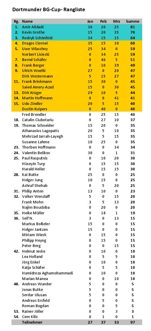 In der Rangliste führt Amir Alidadi mit 81 Punkten, vor Kevin Grothe mit 70 und Rodryk Schönfeld mit 64 Punkten.