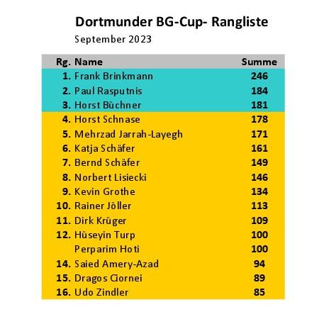 In der Rangliste führt Frank Brinkmann mit 246 Punkten, vor Paul Rasputnis mit 184 Punkten und Horst Büchner mit 181 Punkten.