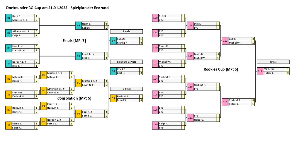 Im Finale trafen Katja Schäfer und Frank Brinkmann auf einander. Katja Schäfer konnte die Begegnung am Ende für sich entscheiden, obwohl Frank eine starke Glücksbringerin an seiner Seite hatte. Für Katja war es der erste Dortmunder Turniersieg.