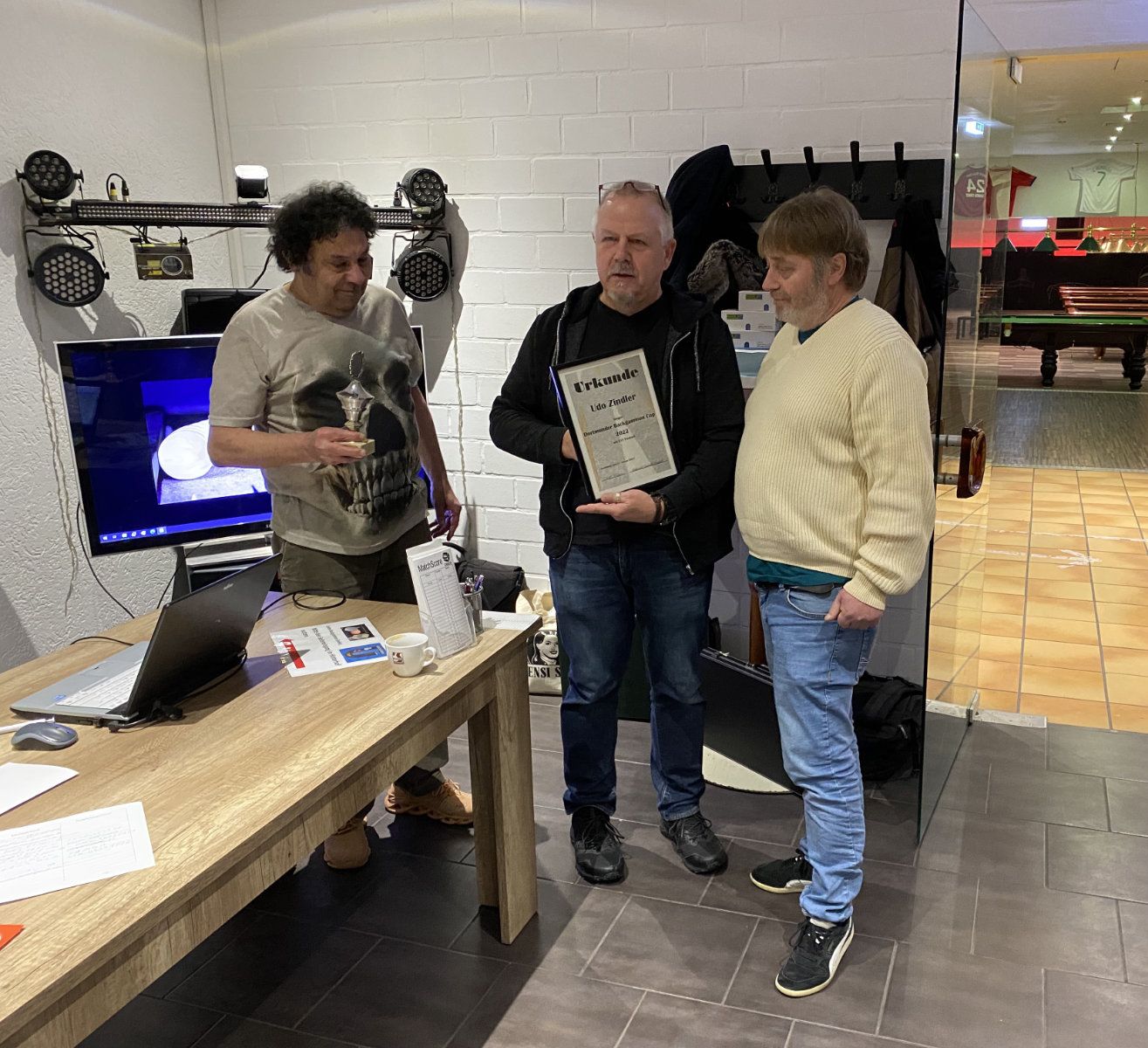 Bevor der Spielbetrieb startete, wurde Udo Zindler für seinen Sieg im Dortmunder Backgammon Cup 2022 geehrt. Herzlichen Glückwunsch an dieser Stelle noch einmal an Udo.