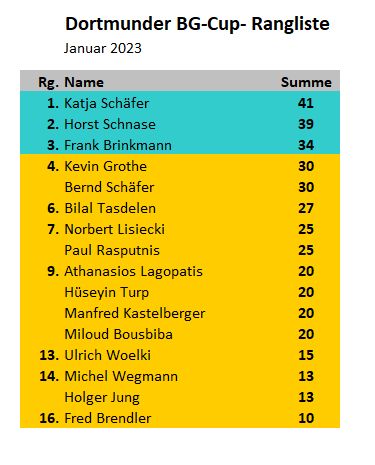 In der Rangliste führt Katja Schäfer mit 41 Punkten vor Horst Schnase mit 39 Punkten und Frank Brinkmann mit 34 Punkten.