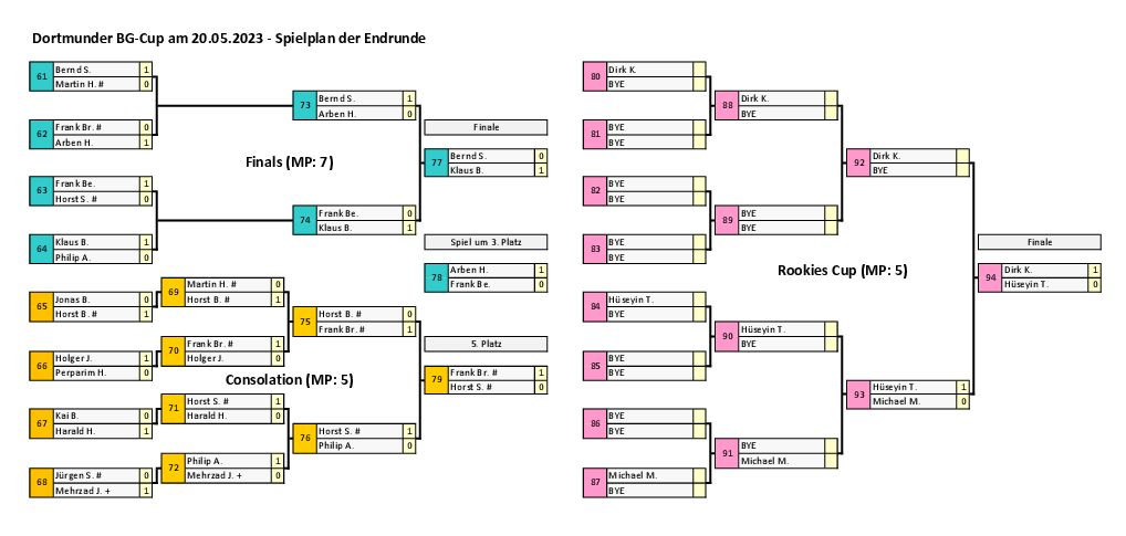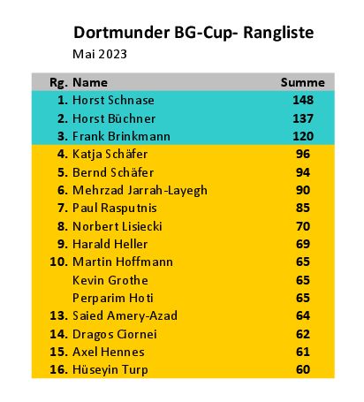am Samstag, dem 20. Mai, haben wir uns im Dortmunder BowlTreff mit hochmotivierten Backgammon Spielern getroffen, um das fünfte von zwölf Dortmunder Turnieren in diesem Jahr auszuspielen. Das Brückentags-Wochenende bescherte uns die bis dato niedrigste Beteiligung in diesem Jahr von 23 Spielern.