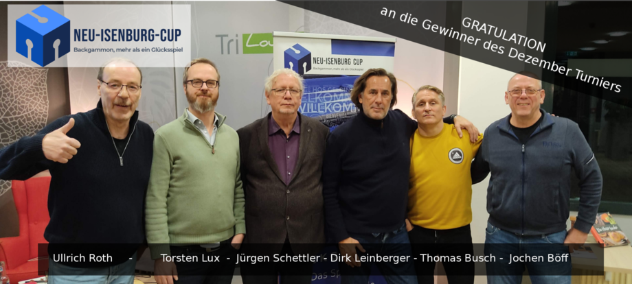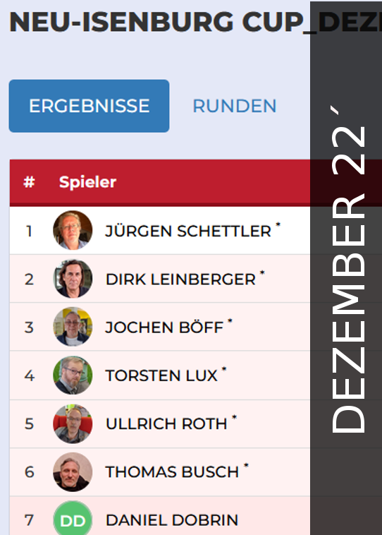 Mit einer Teilnehmerzahl von 31 Spielern kann ich zum Jahresende rückblicken, das sich dieser Turnierstandort fest etabliert hat. Kommen wir jetzt zu den Ergebnissen, in 5 Runden wurden 55 Matches gespielt und am Ende des Tages gab es sechs Finalisten: JÜRGEN SCHETTLER, DIRK LEINBERGER, JOCHEN BÖFF, TORSTEN LUX, ULLRICH ROTH, THOMAS BUSCH die sich den CUP geteilt haben.